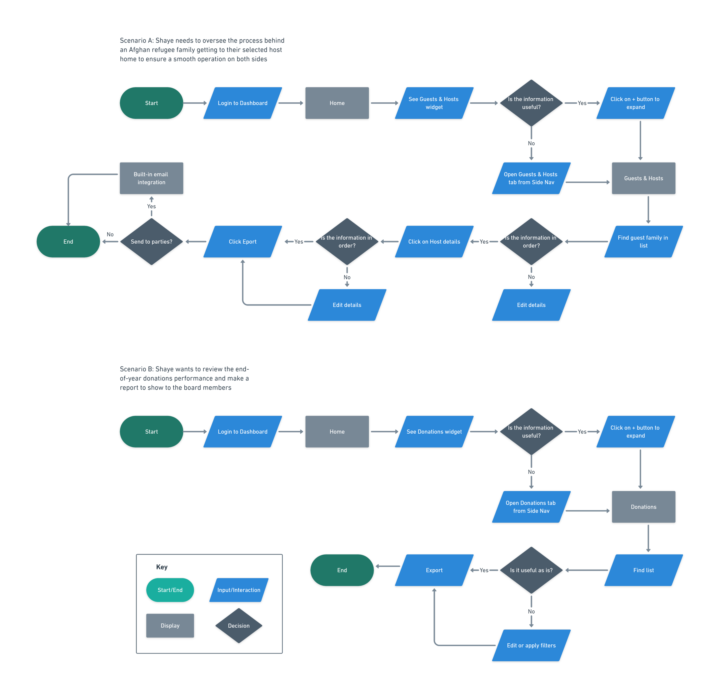 Hypothetically, they would like to design a dashboard that allows them to view information (donations, hosts, etc.) at a glance. They’d like this to be a responsive web design that they can access on desktop and mobile at will.