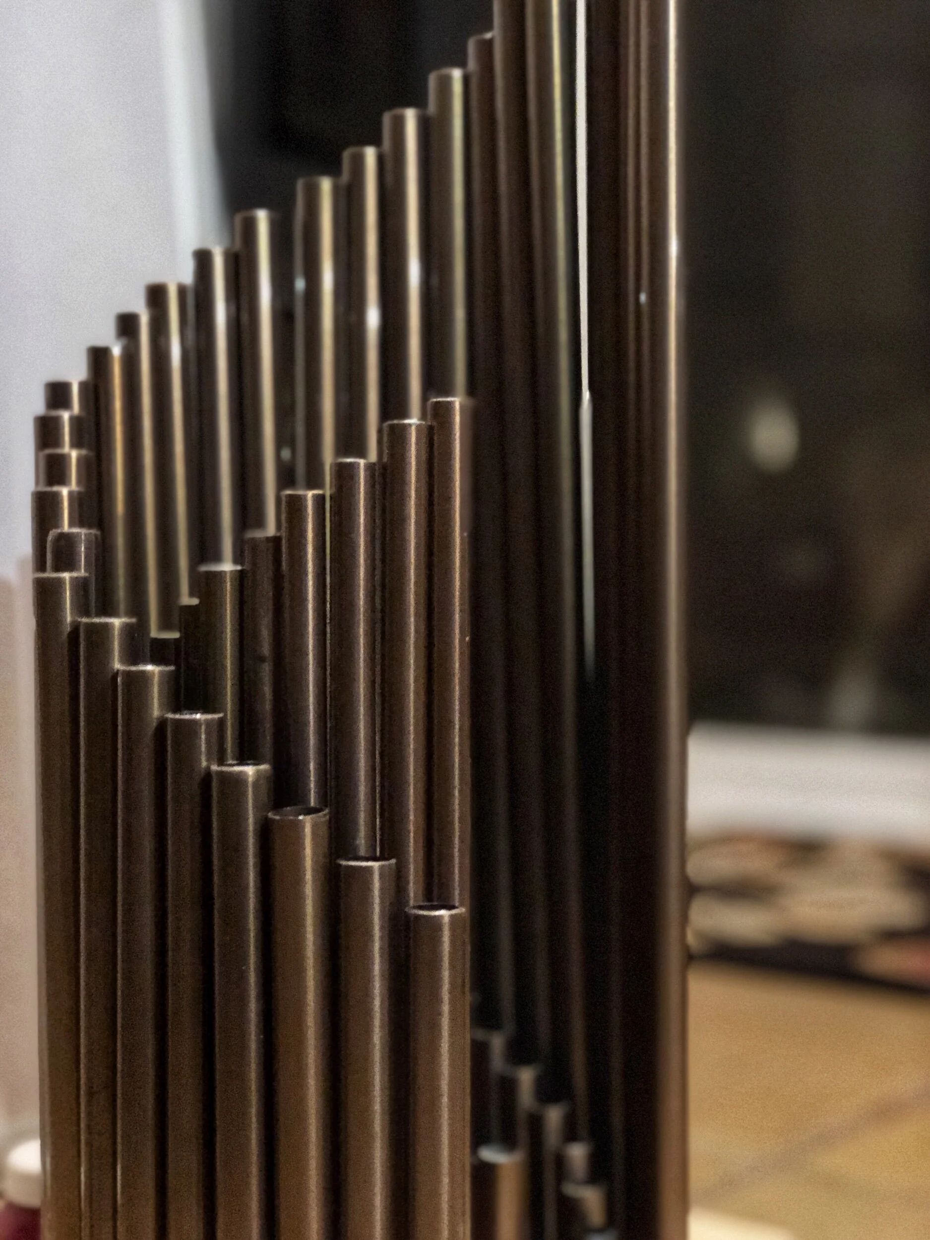 Discarded copper tubes from a house renovation project were repurposed as a sculpture representing nature and space. Much like a flower, it opens up gradually and organically, contrasting the original rigid and utilitarian nature of its copper components. The radial repetition alludes to the tubes’ original shape, yet the intertwining vertical growth of each “row” effectively acts as the piece’s namesake: petals.